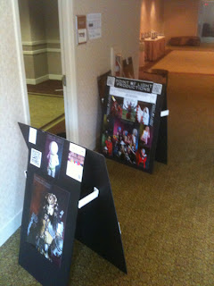 Finally 16 days later, my review of my Animaritime experience. I'll start by saying wow, the convention was extremely organized and the staff were extra helpful, friendly and present on a regular basis. I had my own space at this con and was present as the official photographer. My only real duty was to capture the Masquerade contestants as they came off stage, mainly for judging purposes. To say this was a great gig is an understatement, and though it was "free" work, I think the exposer and experience far outweighs any income in a money sense, though I know most of my peers would not agree. Truth is, the trip to Toronto for Anime North cost about 1000 dollars and I had no return in money from that, but gained lots of exposer, I consider that a success. This trip only cost me around 100 dollars and I ended up meeting and photographing more people and gaining some good contacts, this was a stellar trip in other words. Alright, so enough of that on to the room I had. It wasn't big, but it wasn't tiny, in Toronto I had a 10x10 space, they weren't really divided off, this space was bigger, 20x12, but was inclosed of course being a room. That was better however because it meant I could just leave my stuff close the door and walk away without worrying about gear walking away. The room did have some odd corners, but that actually worked well, as I was able to set up to shoot a a sort of angle. I still haven't picked up a proper background stand but in many ways the direct application of the sheets to the wall really worked in this space. Outside I had my creatively homemade advertisement sandwich boards with images from Anime North and my work so far from Delirium's Edge Designs as well as other info and QR codes to my website. Those worked exactly as I hoped and drew a lot of attention and discussion from onlookers, with one problem however. My company name suggests a group of people, but really it's just me, I really think my name is boring which is why I use Point of Light Productions to sell myself, it's catchy and easy to remember. Small issue however. Alright, here are some images I took of my setup in case my description didn't paint the full picture in your mind.